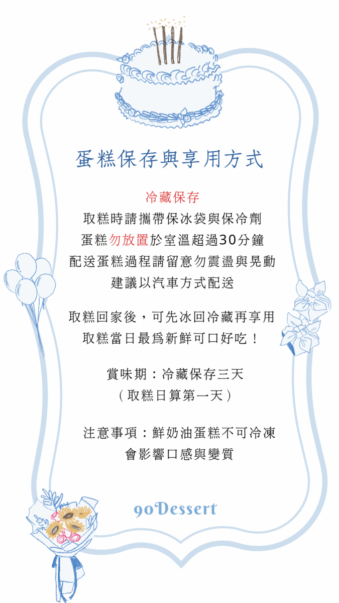 取糕請攜帶保冰袋與保冷劑,以防蛋糕融化,建議以開車方式領取。