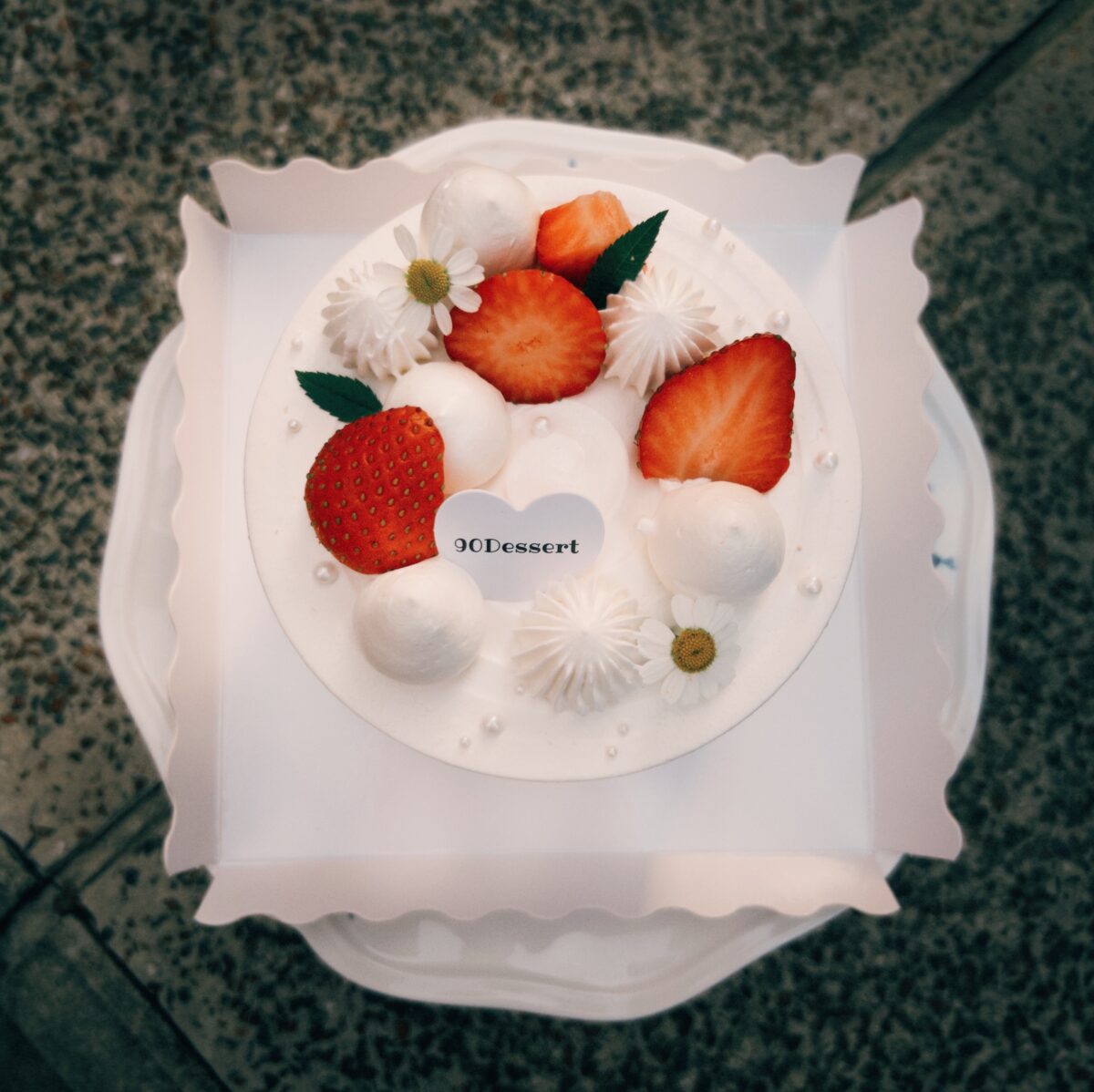 綿密的香草戚風蛋糕體,搭配新鮮草莓與酸甜草莓慕斯,上方以花草點綴,呈現簡約清新的美。